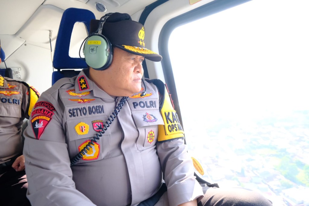 Di atas helikopter milik Polri, Kapolda Sulsel bersama Karo Ops Polda Sulsel serta PJU Polda Sulsel lainnya, berkeliling di atas Kota Makassar dan sekitar dalam memantau pengamanan giat Jalan Santai bersama Capres Ganjar Pranowo yang diikuti Ribuan peserta.