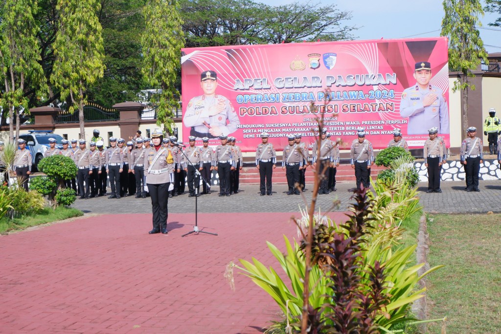 Wakil Kepala Kepolisian Daerah (Wakapolda) Sulawesi Selatan, Brigjen Pol Nasri, S.I.K., M.H., memimpin Apel Gelar Pasukan dalam rangka Operasi Zebra Pallawa 2024 di Lapangan Upacara Mapolda Sulsel, pada Senin (14/10/2024). Operasi ini bertujuan untuk menciptakan kondisi keamanan, keselamatan, ketertiban, dan kelancaran lalu lintas (Kamseltibcarlantas), terutama menjelang pelantikan presiden dan wakil presiden terpilih.