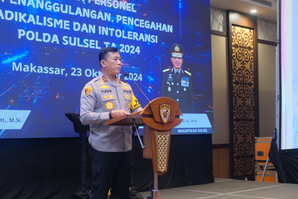 Kepala Kepolisian Daerah Sulawesi Selatan (Kapolda Sulsel), Irjen Pol. Yudhiawan, S.H., S.I.K., M.H., M.Si., memimpin kegiatan pembinaan personel Polri dalam rangka penanggulangan dan pencegahan radikalisme serta intoleransi di lingkungan Polda Sulsel, Rabu, (23/10/2024). Kegiatan yang berlangsung di Ballroom Balla Lompoa Hotel Harper, Makassar, ini turut dihadiri oleh Wakapolda Sulsel, Brigjen Pol. Nasri, S.I.K., M.H., serta sejumlah pejabat utama Polda Sulsel.