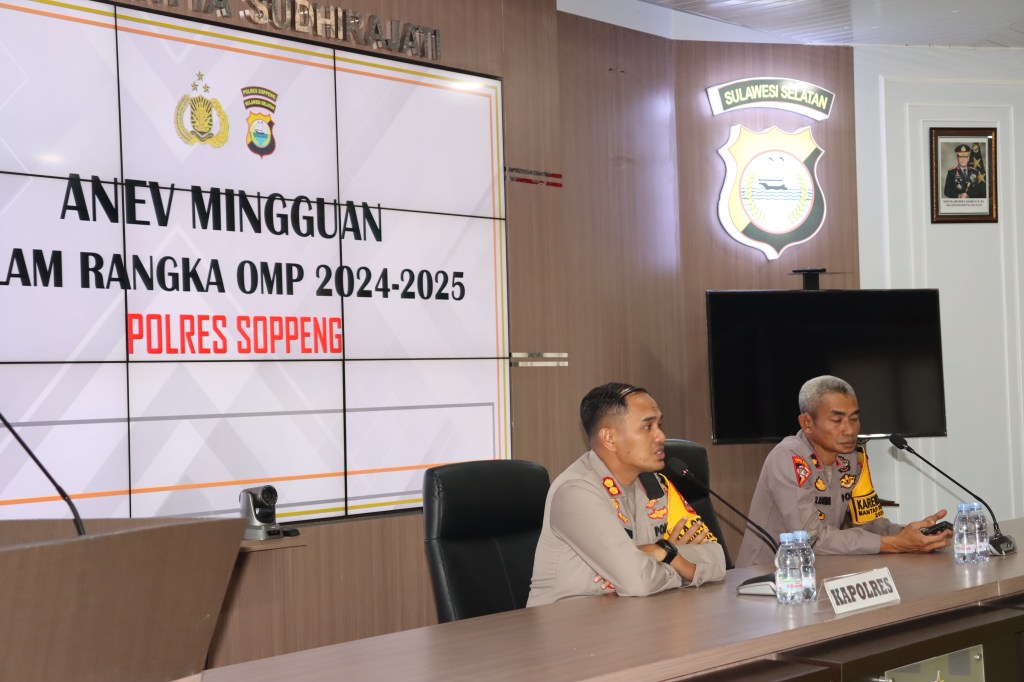 Operasi Mantap Praja 2024-2025 , Polres Soppeng menggelar Analisa dan Evaluasi (Anev) mingguan tentang pelaksanaan dan pelayanan tugas Kepolisian yang dipimpin langsung oleh Kapolres Soppeng AKBP Dr.H Muhammad Yusuf Usman SH, SIK.,MT.,CIPA yang dilaksanakan di Aula Tantya Sudhirajati Polres Soppeng, Rabu (24/10/2024) Pagi.