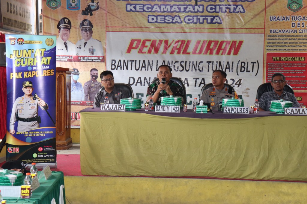 Kapolres Soppeng, AKBP Dr. H. MUH. YUSUF USMAN, S.H.,S.I.K.,M.T.,Cipa,bersama Dandim 1423 Soppeng, LETKOL INF REINHARD HAPOSAN MANURUNG, S.Pd,kembali menggelar Jumat Curhat di Kantor Desa Citta, Kec.Citta, Kab.Sopppeng. Jum’at, 25 Oktober 2024