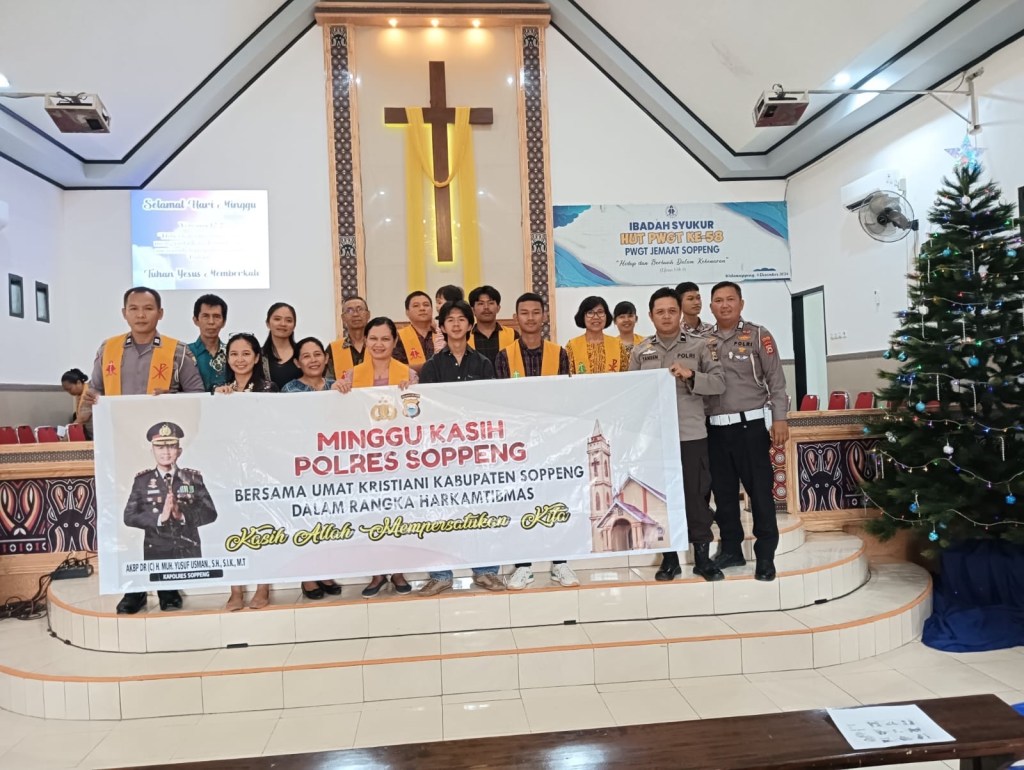 Giat minggu kasih yang di pimpin oleh Banit Gakkum Satlantas Polres Soppeng Aiptu Yulianto P.A maksud dan tujuan giat tersebut untuk menjalin hubungan silahturahmi dengan jemaat gereja Toraja Soppeng dengan pihak Polres Soppeng untuk bersama- sama untuk menjaga situasi Kamtibmas khususnya pasca pelaksanaan Pemilukada 2024.