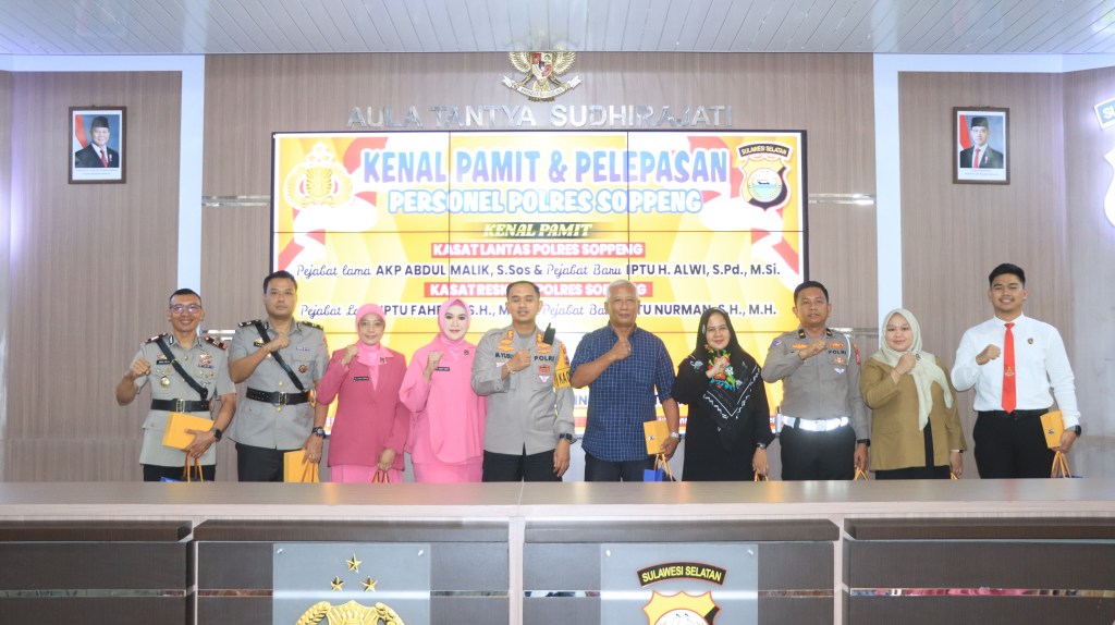 Usai melaksanakan Sertijab, Polres Soppeng menggelar kegiatan “Kenal Pamit”dan pelepasan pejabat yang lama maupun yang baru di Aula Tantya Sudhirajati Polres Soppeng Senin /9/2024.
