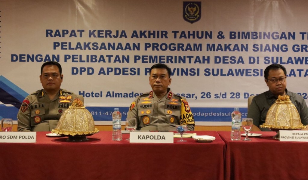 Kapolda Sulawesi Selatan, Irjen Pol. Yudhiawan, S.H., S.I.K., M.H., M.Si., membuka sekaligus menjadi narasumber dalam acara Bimbingan Teknis (Bimtek) Pelaksanaan Program Makan Siang Gratis yang diselenggarakan oleh Asosiasi Pemerintah Desa Seluruh Indonesia (APDESI) di Hotel Almadera, Kota Makassar, Jumat (27/12/24).