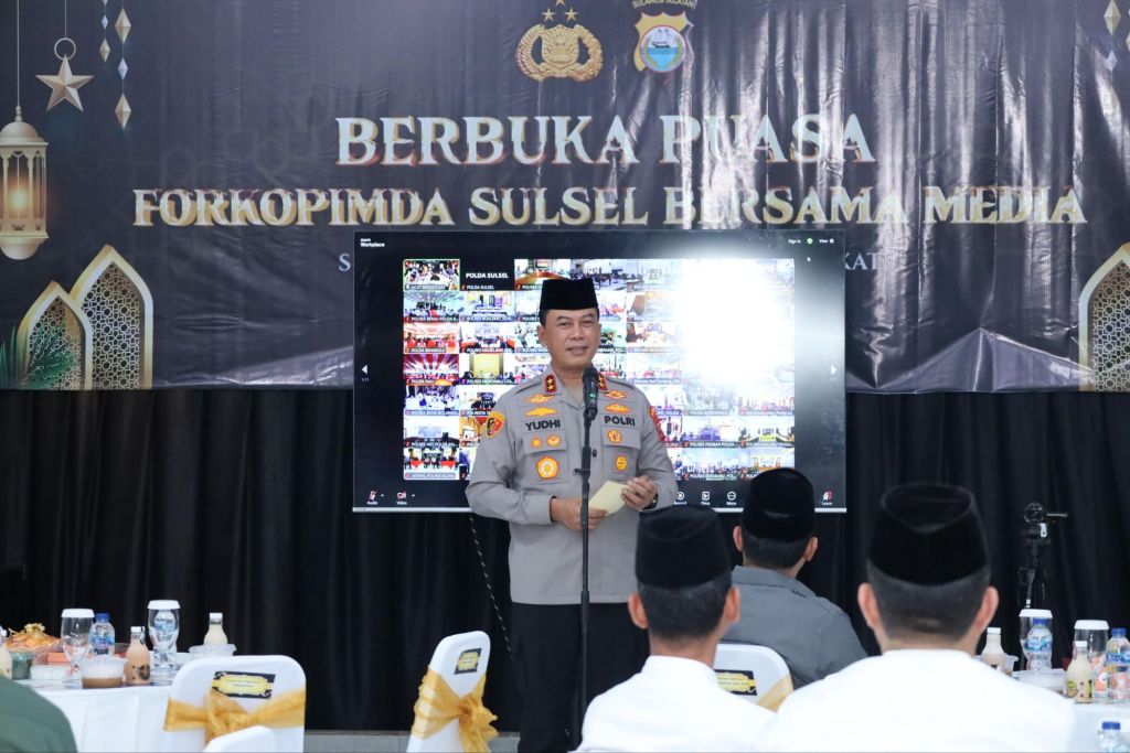 *Buka Puasa Bersama Media, Kapolda Sulsel Tekankan Sinergi Demi Kamtibmas Kondusif*Kapolda Sulawesi Selatan, Irjen Pol. Yudhiawan S.H., S.I.K., M.H., M.Si., menggelar acara Buka Puasa Bersama Forkopimda Sulsel dan insan media di Rumah Jabatan Kapolda Sulsel pada Kamis (06/03). Acara ini menjadi momentum penting dalam mempererat sinergi antara aparat kepolisian, pemerintah daerah, dan media dalam menciptakan situasi keamanan dan ketertiban masyarakat (kamtibmas) yang kondusif.Hadir dalam kegiatan tersebut, Gubernur Sulawesi Selatan Andi Sudirman Sulaiman, ST., Ketua DPRD Sulsel Andi Rachmatika Dewi, Pangdiv 3 Kostrad Mayjen TNI Bangun Nawoko, S.I.P., Kajati Sulsel, Agus Salim serta Para tamu undangan dari berbagai media turut hadirDalam sambutannya, Kapolda Sulsel menyampaikan apresiasi atas kehadiran insan media dan menegaskan bahwa kegiatan ini merupakan wujud kebersamaan Forkopimda Sulsel bersama masyarakat, khususnya media. “Media memiliki peran strategis dalam memberikan informasi yang berkualitas serta mengajak masyarakat untuk berpartisipasi dalam mendukung dan memahami tugas kepolisian,” ujar Irjen Pol. Yudhiawan.Kapolda menekankan pentingnya sinergitas dan kolaborasi antara kepolisian dan media guna menciptakan lingkungan yang lebih aman dan kondusif. Ia berharap hubungan baik antara Polda Sulsel dan insan media dapat terus terjalin sehingga saling mendukung dalam menjalankan tugas masing-masing.Buka puasa bersama ini juga merupakan bagian dari program nasional “Buka Puasa Bersama Polri dan Media” yang serentak dilaksanakan di seluruh Indonesia. Program ini menegaskan komitmen Polri dalam menjalin kedekatan dengan masyarakat melalui insan pers sebagai mitra strategis.Suasana hangat dan penuh kebersamaan mewarnai kegiatan ini, menegaskan bahwa sinergi antara aparat kepolisian dan media akan terus dijaga demi keamanan dan kesejahteraan masyarakat Sulawesi Selatan.